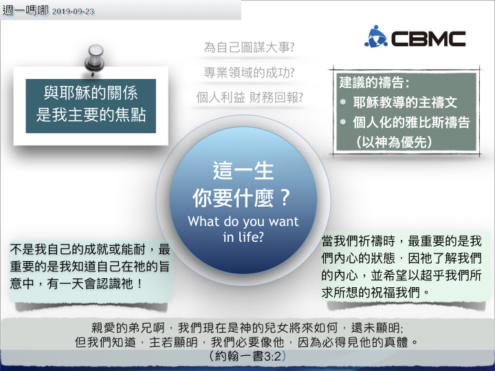我意識到這不是我自己的成就或能耐。最重要的是我知道自己在祂的旨意中,有一天會認識祂,如約翰一書3章2節所說的:「親愛的弟兄啊,我們現在是 神的兒女,將來如何,還未顯明;但我們知道,主若顯現,我們必要像他,因為必得見他的真體。」你這一生想要甚麼?與耶穌的關係是你主要的焦點。