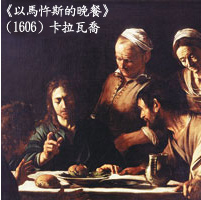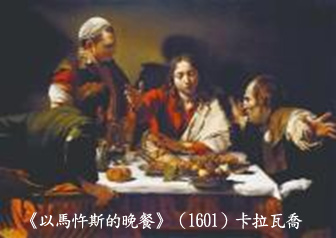 復活的基督在以馬忤斯路上,教導門徒聖經和與門徒分享餅和酒,就象徵復活的基督藉聖道和聖禮活在教會中。[ii] 卡拉瓦喬以以馬忤斯的晚餐畫作,來救贖自己的罪行,因為基督的死,就是為我們贖罪,領受他的聖體寶血,就是接受他的救贖。