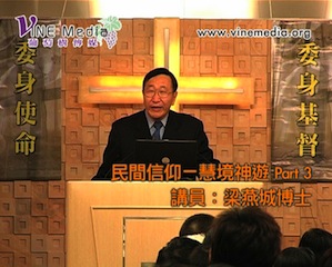 你發覺佛教很小有佈道會,他不是叫你舉手信佛教。但有辦法,就你拜那一個神,你拜的都很高,我將你這個神放到我的廟裏,你自然會去我的廟拜,都有這個神,是嗎?即他的廟同樣有我所拜的神,我便去。一個最明確的,你留意關公,關公是一個中國的神,中國人所拜的神,關公的故事跟佛教無關的,但你有沒有發現,佛廟裡有關公,很多時守門口的,就是跟韋陀一起,有時四大天王,其中一個是關公,就是因為關公穿著盔甲,跟四大天王比較相似,又或者跟四大天王的手下韋陀,那些將軍相似。於是就有一個故事,關公死後就,由鬼變成妖怪,就在那個山上,當時天台宗,那個智海,智者大師,去開宗派時,發覺山邊有一隻妖怪難阻他,跟他鬥,那隻妖怪拿大刀,後來收服了那隻妖怪,原來那隻妖怪是關公,關公死後,冤魂不散,關公見這個大師那麼棒,他說:「我也願聞佛法。」於是那大師跟他講佛教,於是關公死後,變成鬼就信了佛教,於是以後,我替你守門口吧,叫做迦南菩薩,有些人讀「騎南」菩薩,那我以後是替你守門口的菩薩,於是封關公為菩薩,就守門口。關公是道教的大神,佛教收服關公入佛教,做菩薩,然後守門口。
