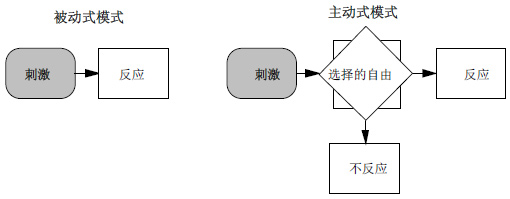 什麼使人憤怒?回答是除你自己之外,沒有任何東西能使你憤怒。憤怒的人自己使自己憤怒。「不要為作惡的心懷不平。」(詩篇 37:1)人憤怒是因為他自己選擇了憤怒。憤怒是一個決定、一個選擇。圖2-1 是摘自史迪文‧寇維所著的《有非凡成就人的七個習慣》。這很好地說明了我們有如何反應的選擇。左圖被寇維博士稱做「被動式模式」。這個模式所顯示的就像「難以置信的廢船」中演的一樣,大家雖普遍認同這種觀點,卻它卻是錯誤的:我們是外界刺激的被動受害者,我們不得不對這刺激做出反射性的反應。右圖則表明,在刺激和反應之間,我們都有選擇,可以選擇如何做出反應。寇維博士稱此為「主動式模式」。
