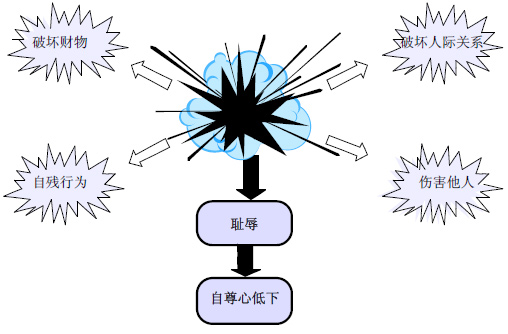 憤怒的表現,從不愉快,一時發火到付諸暴力,各不相同。發脾氣時最常見的行為多是身體上的表現,如吵罵,打架,敵對,甚至肉體上的虐待。但是,隱而不見的憤怒也會以不和、不滿、玩世不恭、譏諷、被動的攻擊行為、給同學起外號、怨恨及態度惡劣表現出來。